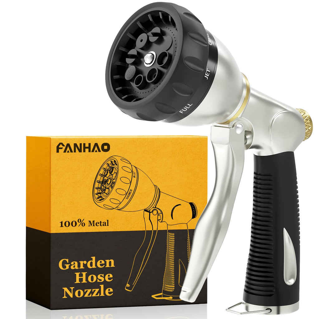 - PROFESSIONAL-GRADE HOSE SPRAY NOZZLE--100% Metal. Die cast metal construction for lasting performance. FANHAO garden hose nozzle is extra heavy duty made from premium zinc alloy. High quality to prevent leak, rust, corrosion and wear, is much STRONGER and DURABLE than plastic water nozzles. A shock resistant rubberized bezel dial protects the sprayer from accidental drops.