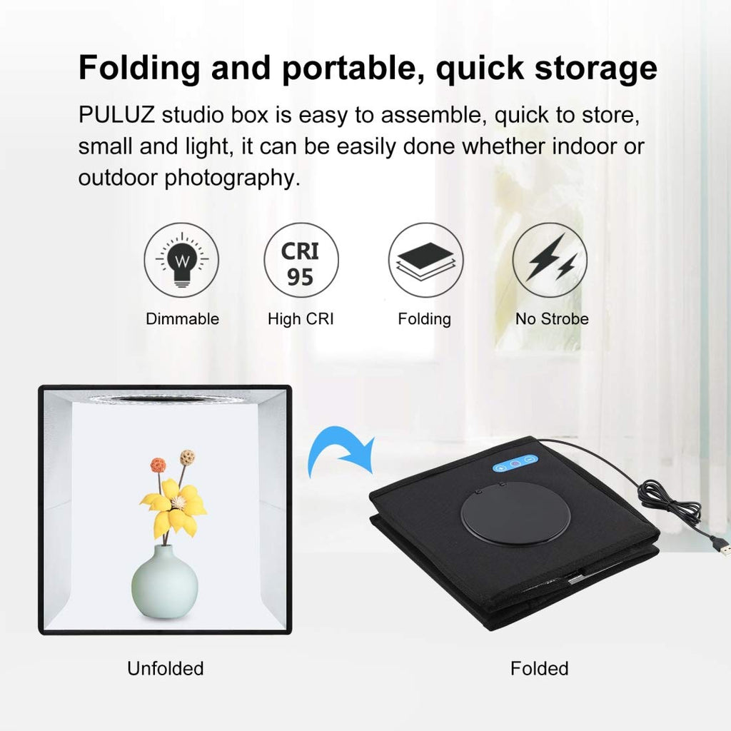 - POROTABLE AND CONVENIENT -- Foldable and portable design makes it easily set up and carry, making mobile lighting studio possible. No other tools needed for the installation and uninstallation. The photo box folds into itself as a storage bag in which adapter and other objects can be put, no extra package is required