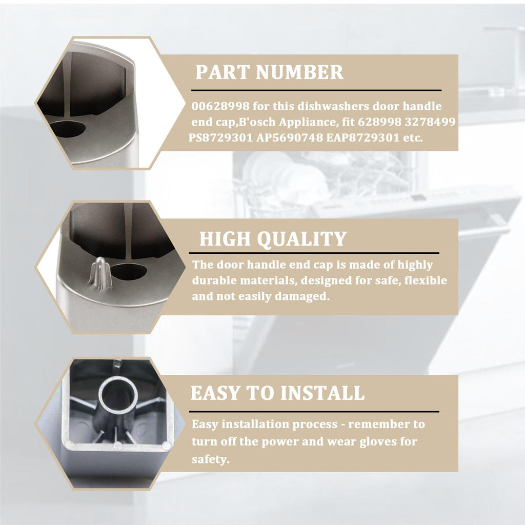 - 【Perfect Replacement】: The Dishwasher Replacement Handles End Cap Part Number: 00628998. Replaces Part Numbers: 3278499, 628998, PS8729301. PS:If You Are Not Sure About The Applicable Model, It Is Recommended That You Look It Up On The Bosch Website. In The Replacement Parts List, Enter Your Model Number And Scan The Parts List Or View A Diagram Of The Machine Door. The Part Number Will Be Listed In These Two Places.