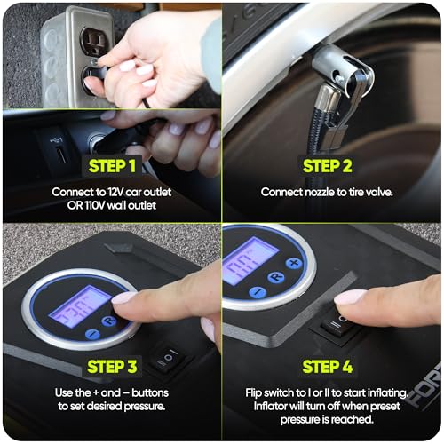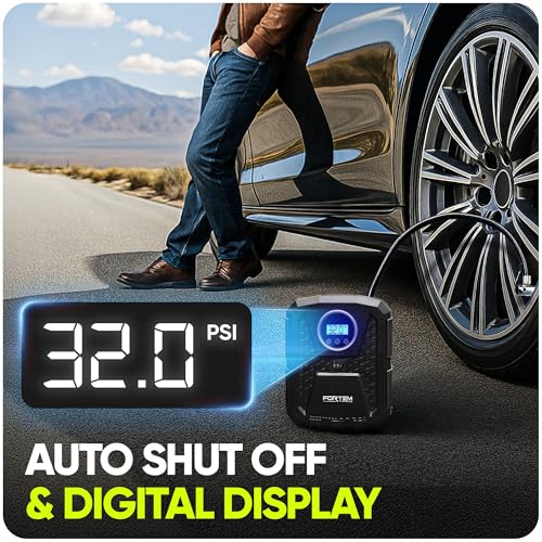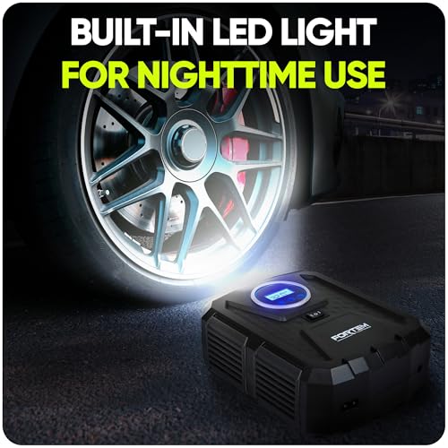 - Built-In Safety Features- Super bright automatic LED flashlight makes our car air pump suitable for roadside emergency and nighttime use. Fortem 12v air compressor is ready whenever you need to inflate a flat tire.