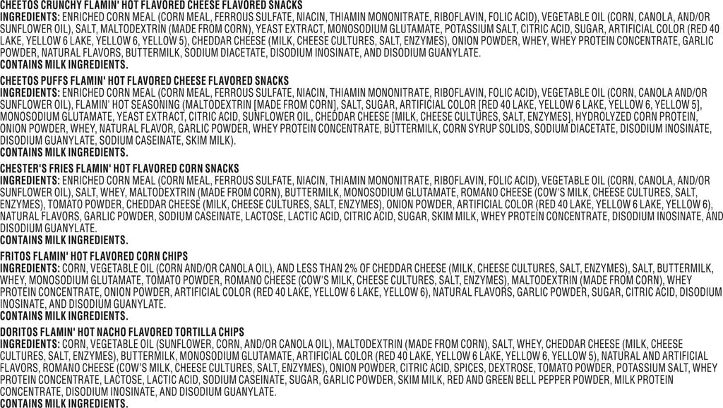 - Frito-Lay Snacks Flamin' Hot Spicy Mix Variety Pack includes (3) Fritos Flamin' Hot Corn Chips, (2) Doritos Flamin' Hot Tortilla Chips, (5) Cheetos Crunchy Flamin' Hot Cheese Snacks, (5) Cheetos Puffs Flamin' Hot, (3) Chesters Flamin' Hot Fries