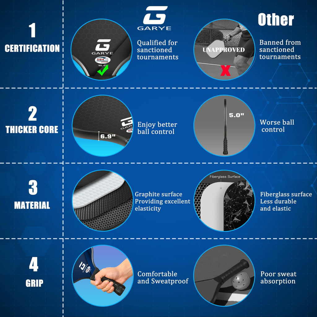 - 【USAPA Approved】GARYE WL-01 pickleball paddles set of 4 are tested and approved by the USAPA for tournament play and international pickleball events. Each pickle ball paddle in the GARYE WL-01 series is manufactured strictly according to USAPA standards, and carries a USAPA approval label. You can find further details on the USA Pickleball website.