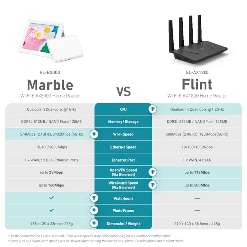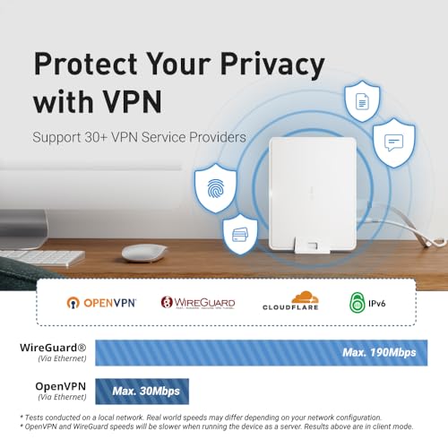 - 【Enhanced Security with VPN Support】A wifi router with pre-installed OpenVPN and WireGuard, compatible with 30+ VPN service providers. Encrypts all network traffic within the connected network. Max. VPN speeds of 30Mbps (OpenVPN); 190 Mbps (WireGuard).