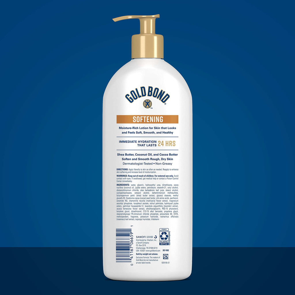 Details: Condition rough, dry skin with Gold Bond Softening Lotion. This hydrating lotion for normal to dry skin is made with a triple moisture complex featuring shea butter, coconut oil and cocoa butter that conditions skin, leaving it silky smooth. It provides immediate hydration that lasts 24 hours. What's more, Gold Bond Softening Lotion contains 7 moisturizers and 3 nourishing vitamins for skin that looks and feels soft, smooth, and healthy. This moisture-rich lotion is dermatologist-tested, nongreasy and has a light, fresh scent. DIRECTIONS: Apply liberally to skin as often as needed. Reapply to enhance skin softening and increase level of moisturization.