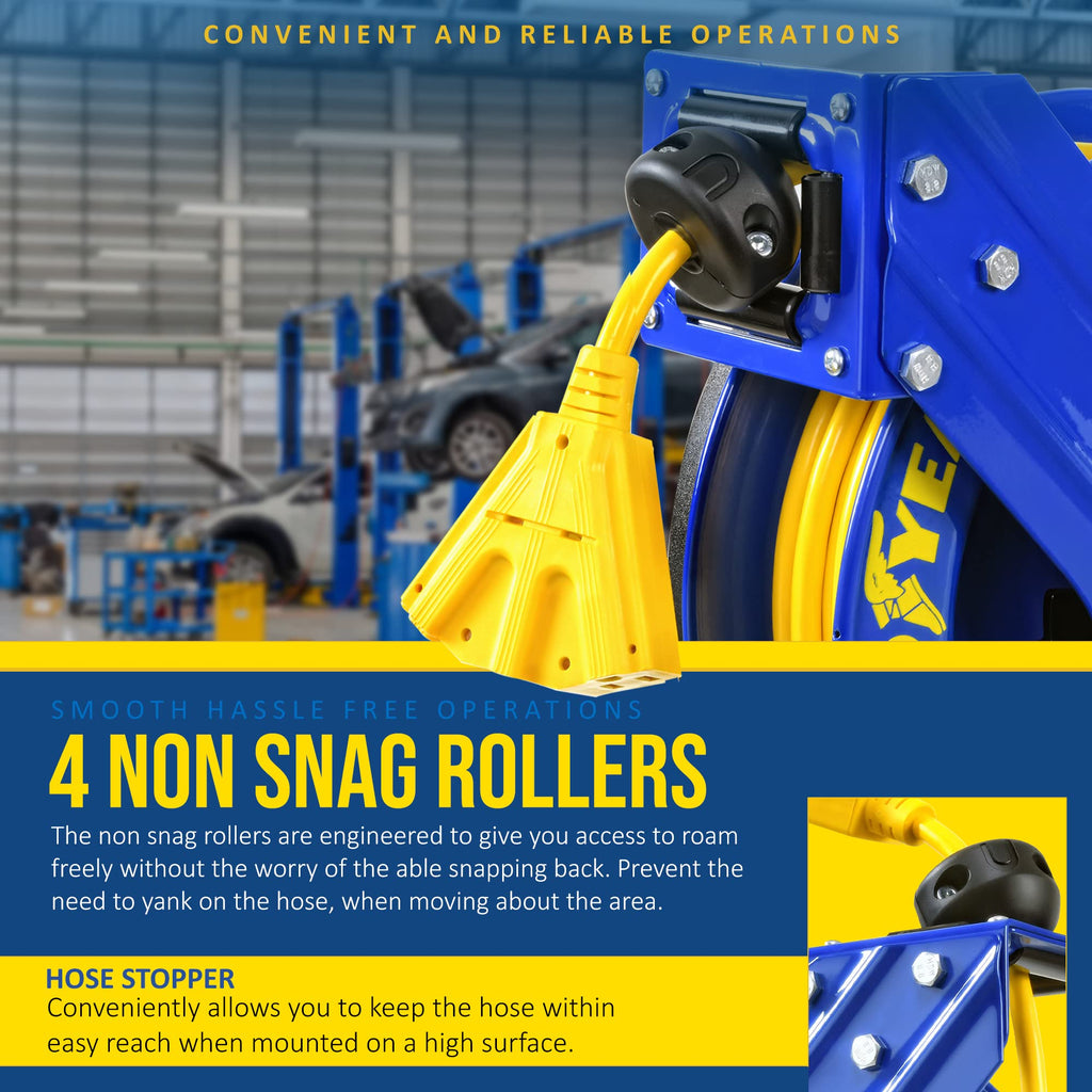 - UNIQUE FEATURES - This Cord Reel utilizes with a 3-prong plug NEMA 5-15R / NEMA 5-15P and includes a 60" inch Lead-in Cord, Adjustable Cable Stopper and 4 Non Snag Rollers to reduce cord abrasion; Circuit Breaker included to protect reel and operator