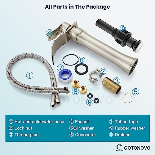 - 4️⃣ [Sink Faucet and Accessories] : Vessel bathroom sink faucet body, Cold and hot water suppler hose, Pop Up Drain, the instruction.