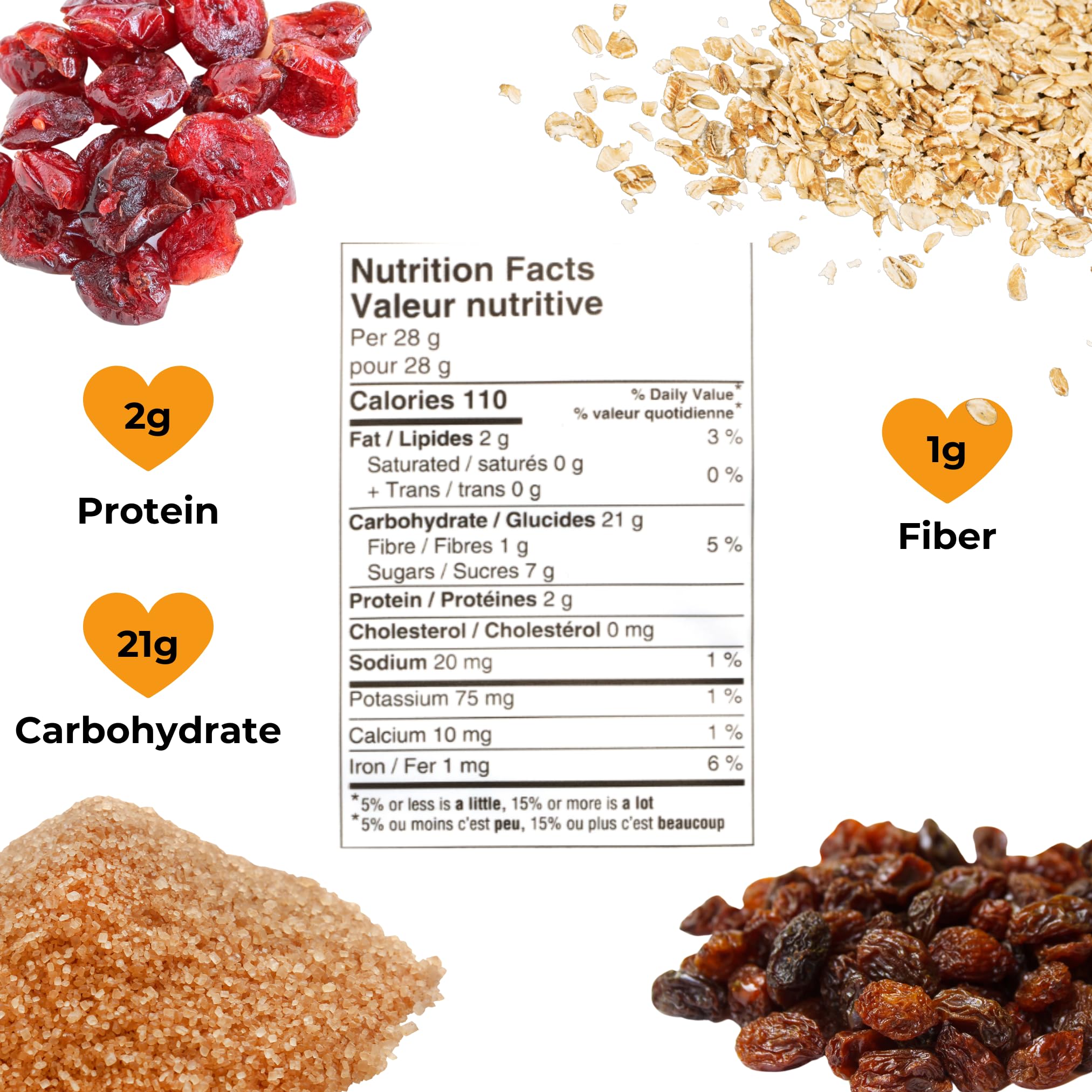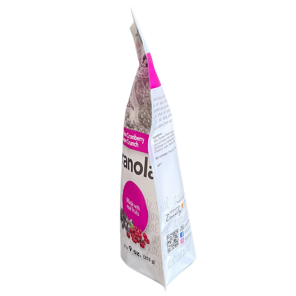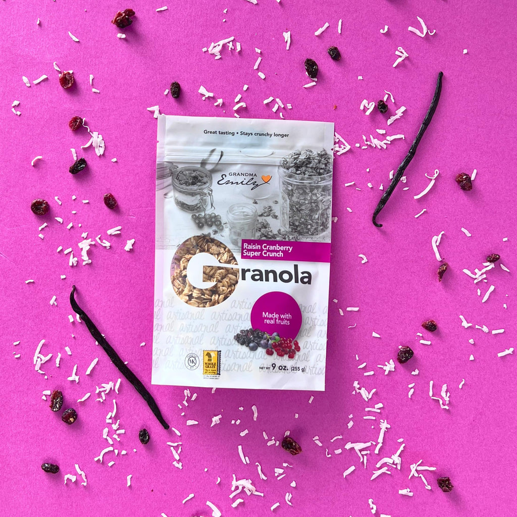 - Pack of One (1) 9 ounce Grandma Emily Super Crunch Raisin Cranberry Breakfast Granola Cereal made with oats, nuts, coconut, blueberries, cranberries