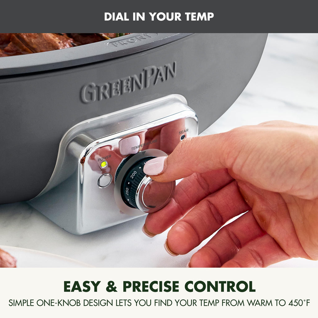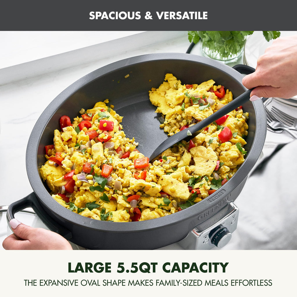 Details: Designed for everyday cooking, this versatile and spacious skillet delivers endless meal options that are free of PFAS & full of flavor. The one-touch rapid searing and embedded heating element delivers precise temps while our healthy ceramic nonstick makes cleaning a breeze. Whether you’re searing a steak, perfecting a complex stew, or simply making rice, this family-sized 5.5-quart skillet gives you room for any meal. The high sides eliminate splatter and make it easy to toss your ingredients without worry. Plus, our Thermolon™ Volt ceramic nonstick is specially designed to withstand the strain of modern appliances and doesn’t break down like traditional coatings. Plus, it’s free of PFAS, PFOA, lead, and cadmium for worry-free meals every time.