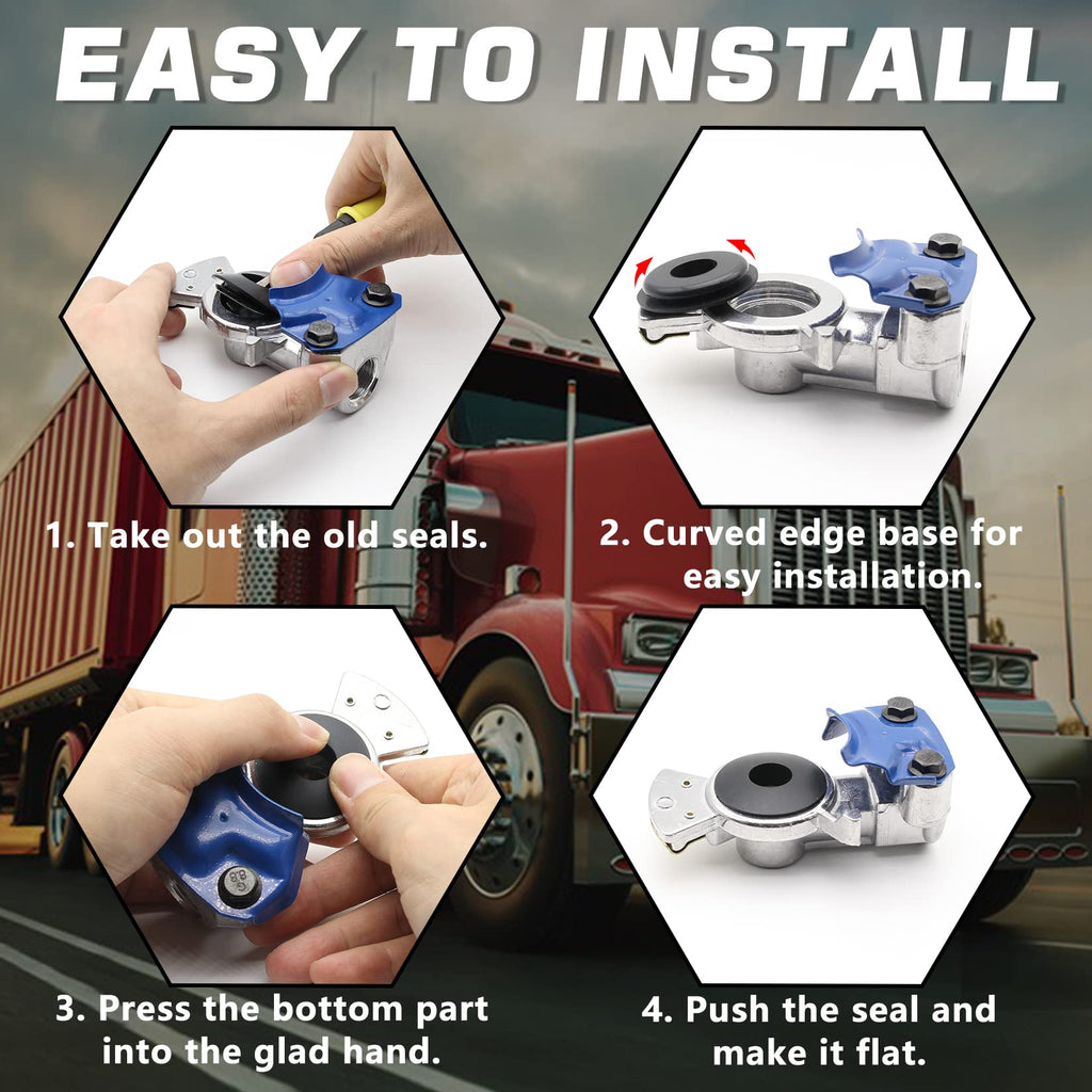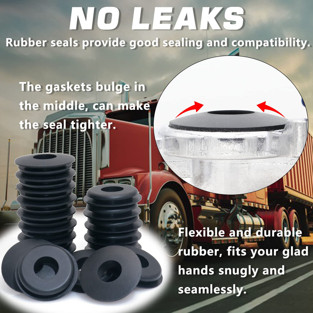 - 【FINE WORKMANSHIP & EASY TO INSTALL】- These glad hand seals are fine workmanship, soft touch and smooth surface. The gaskets bulge in the middle, make the seal tighter. Seals with a curved edge base for easy to install, just press the bottom part into the glad hand. Perfect for your truck.