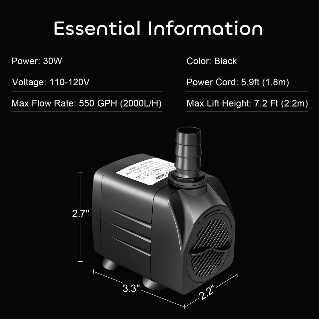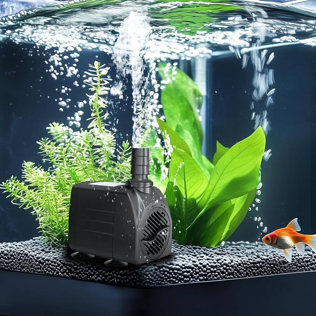 - WIDE APPLICATION -- The water fountain pump circulates and aerates the water, making it more attractive to your fish or turtles. This submersible pump is ideal for aquariums, fountains, spouts hydroponic systems, etc