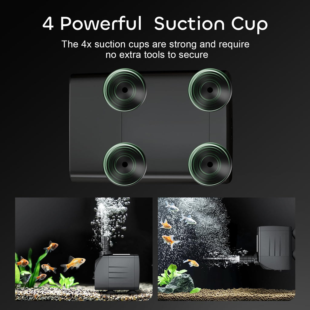 - SUCTION CUP & 5.9FT POWER CORD -- The aquarium pump has a long enough cord for easy installation. 4 independent powerful suction cups help keep it in place so you can stick it vertically or horizontally to the right side of your aquarium