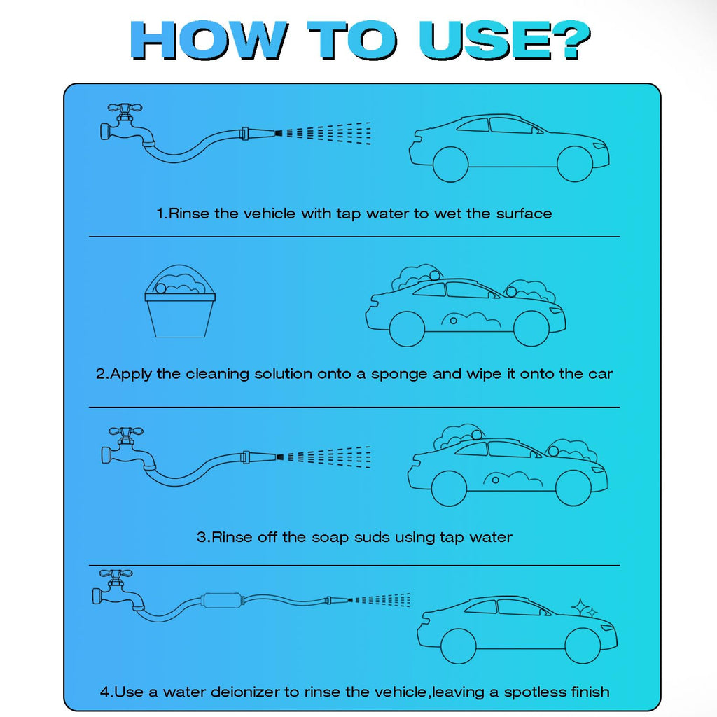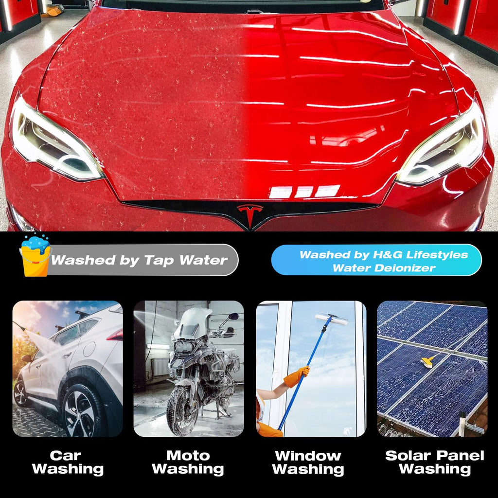 - Achieve Spotless Results: Start with tap water for the initial wash, then finish with our Water Deionizer for a final rinse, ensuring a pristine car surface. Each water deionizer can produce 50 gallons of pure water, providing approximately 16-25 washes (assuming each final rinse requires 2-3 gallons of water), delivering lasting value and a spot-free shine. Please note that actual usage may vary depending on the water volume needed for each wash.