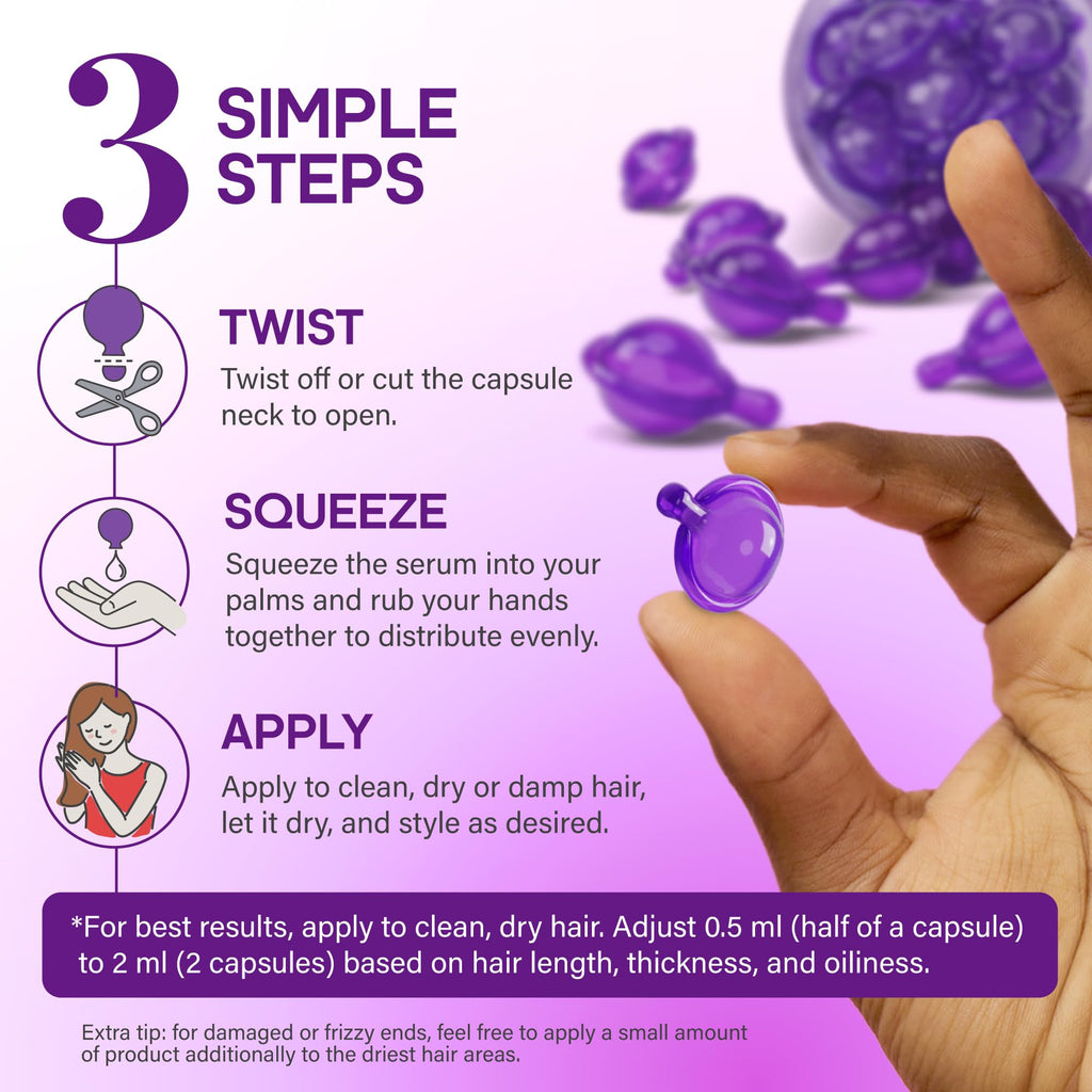 - 💜 Nutrient‑Rich & Safe Formula — packed with Vitamins A, E & B5, these hair oil capsules help shield against heat & environmental damage. Free from parabens, sulfates & cruelty‑free for guilt‑free beauty.