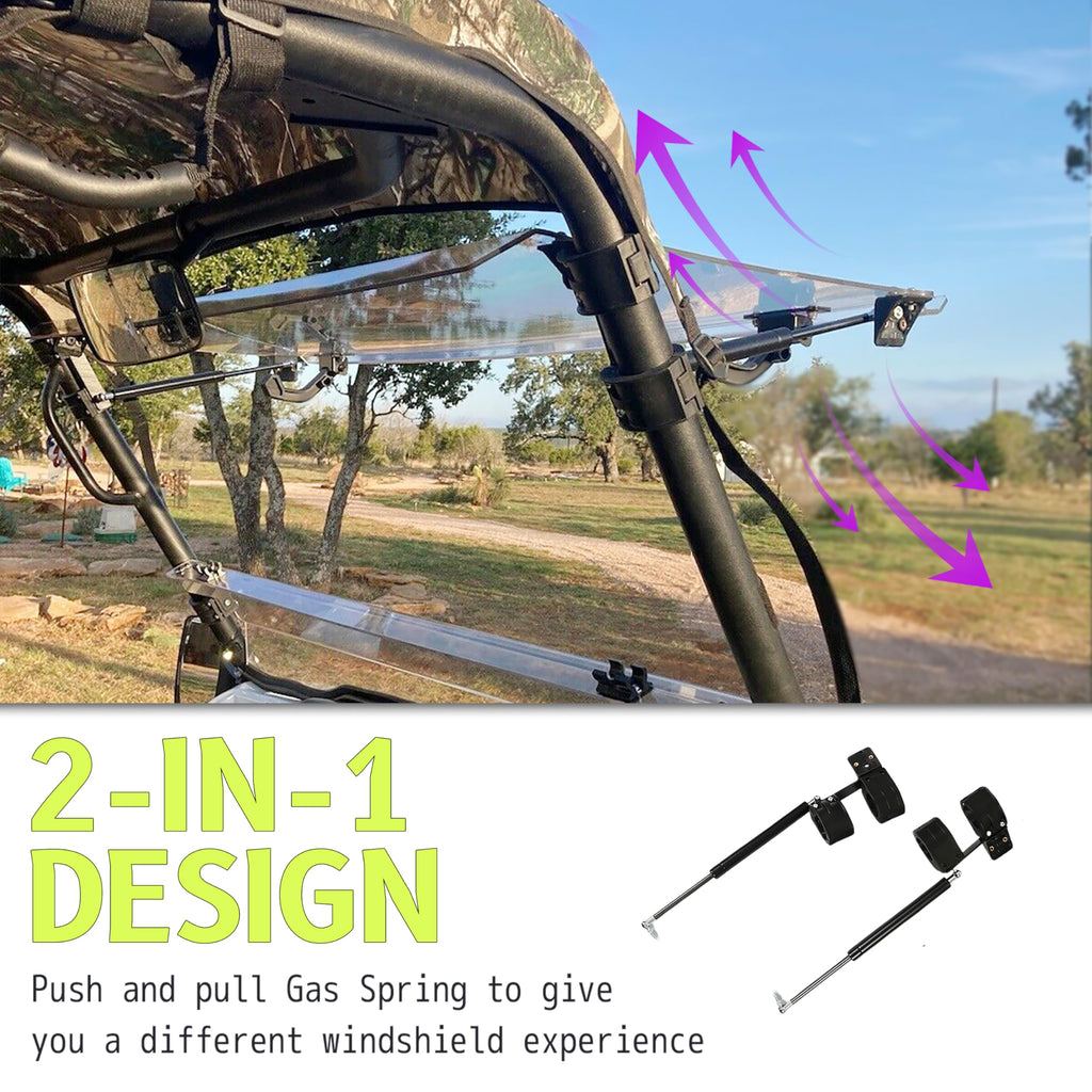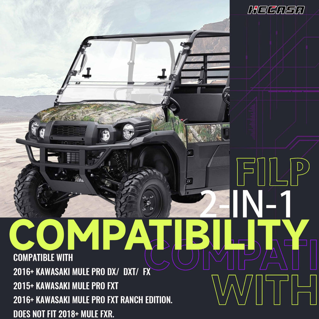 - FITMENT- Scratch Resistant 2-IN-1 Folding Windshield Compatible with 2016+ Kawasaki Mule Pro DX, 2016+ Kawasaki Mule Pro DXT, 2016+ Kawasaki Mule Pro FX, 2015+ Kawasaki Mule Pro FXT, 2016+ Kawasaki Mule Pro FXT Ranch Edition. Does NOT Fit 2018+ Mule FXR. Please confirm whether it fits your vehicle before purchasing.