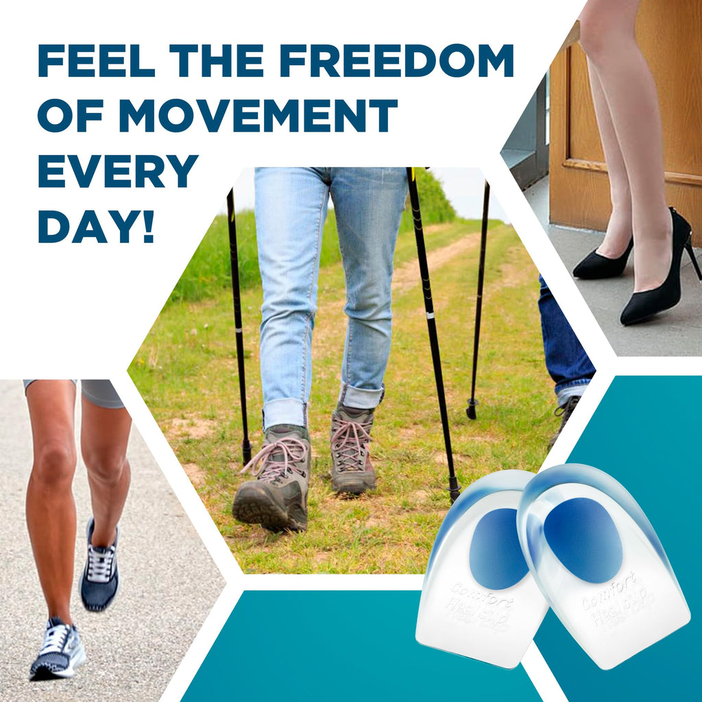- You Get - This set includes one pair of comfortable gel heel cups that can be worn in most shoe styles, including athletic shoes, dress shoes, and boots. They can be worn all day whether you are playing sports, running, working, or standing all day. They cushion your heel and provide shock absorption relief