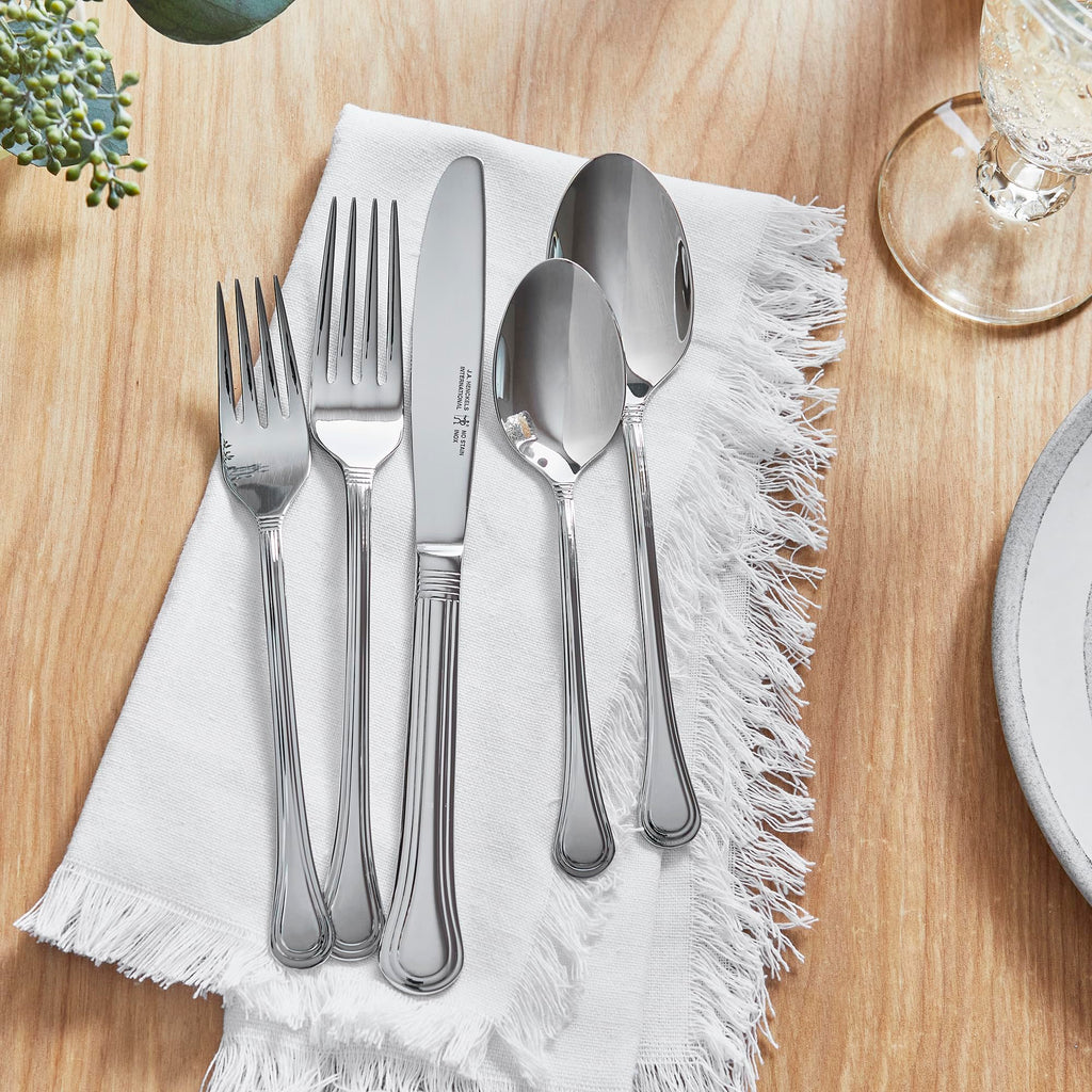 Details: Henckels International makes essential kitchen tools every home chef needs. With Henckels International Flatware, this trusted brand brings over 120 years of cutlery expertise to the world of flatware. Each piece is fabricated from high-quality 18/10 stainless steel for optimal corrosion resistance with a luster finish. The flatware features carefully polished surfaces and edges which both look and feel good. As one would expect from a longstanding cutlery company, the knives offer superior cutting precision. Produced in compliance with Henckels International's strict quality standards, each spoon, knife, and fork offers everyday durability. Easy to care for, the dishwasher safe flatware will beautify your tabletop for many years to come. Astley features a brilliant mirror finish. The edges of each handle are adorned with a linear accent. The detailing on this pattern is subtle but elegant.