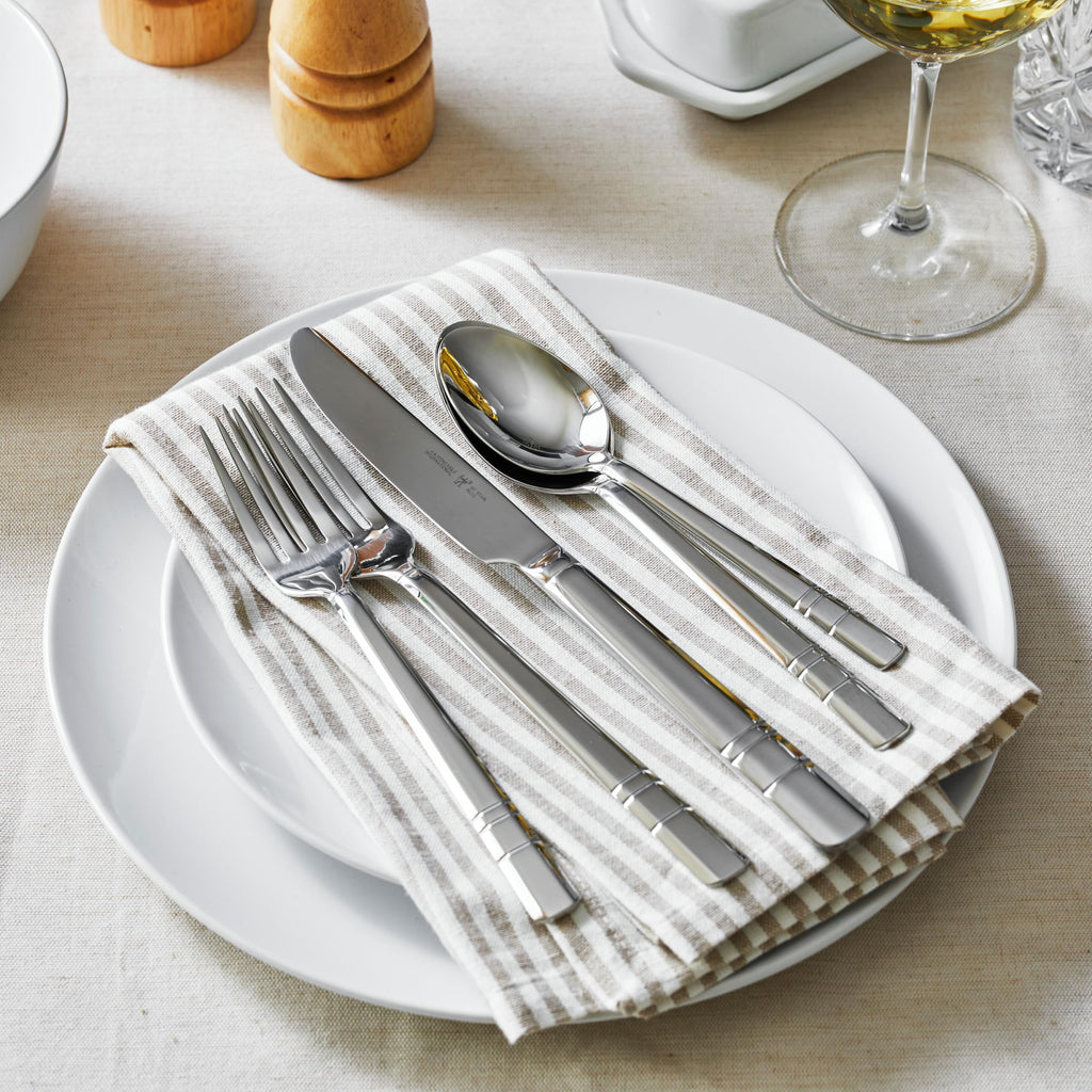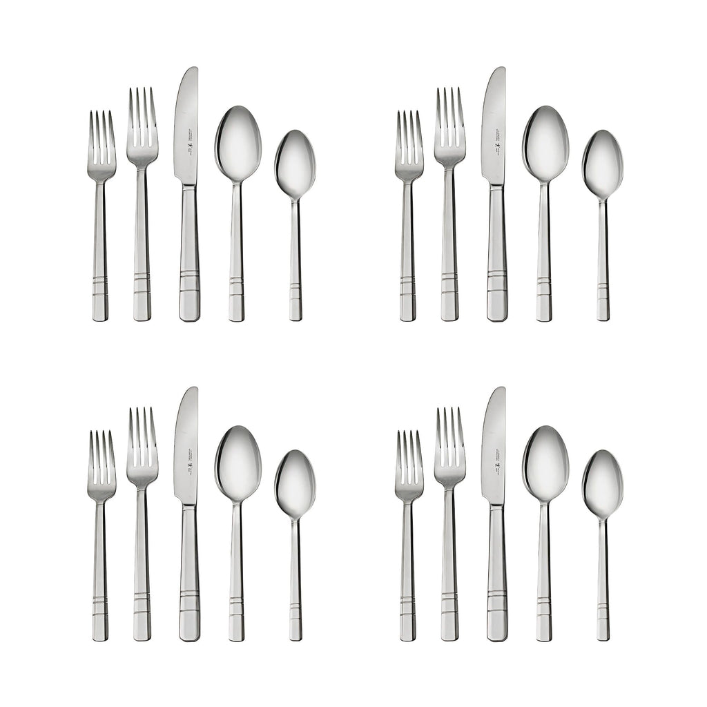 Details: Henckels International makes essential kitchen tools every home chef needs. With HI Flatware, this trusted brand brings over 120 years of cutlery expertise to the world of flatware. Each piece is fabricated from high-quality 18/10 stainless steel for optimal corrosion resistance with a luster finish. The flatware features carefully polished surfaces and edges which both look and feel good. As one would expect from a longstanding cutlery company, the knives offer superior cutting precision. Produced in compliance with Henckels International's strict quality standards, each spoon, knife, and fork offers everyday durability. Easy to care for, the dishwasher safe flatware will beautify your tabletop for many years to come. A sophisticated design with linear accents and a beveled edge on each handle, Madison Square will capture interest on the dining table.