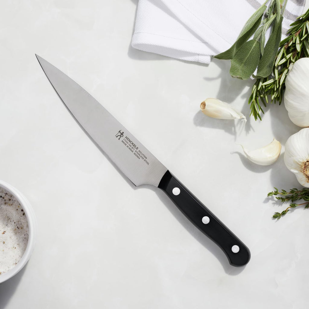 Details: Since 1895, Henckels International has been making high quality, everyday knives at an exceptional value. Fabricated from high-quality stainless steel, the single-piece, precision-stamped knife blades are lightweight without sacrificing strength and durability. Along with the ergonomic, traditional triple-rivet handle, enjoy maximum maneuverability and fatigue-free cutting. Honed for long-lasting sharpness, the fine-edge blades boast precision cutting. Curved for comfort, the break-proof, triple-rivet handles are pleasant to grip, giving you the control you need to slice through tougher cuts with ease.