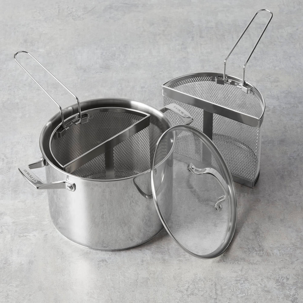 Details: The do-it-all pot for quick and easy everyday dinners.Boil, steam, and blanch an entire weekday dinner in this roomy 8.5-quart pasta pot. Handy for quick one-pot meals on busy days, you can cook for the entire family in less time and with less clean up. This all-in-one pot features two colanders for boiling pasta in one and blanching veggies in the other. Or use the two colanders to cook pasta to everyone's liking by boiling two batches of pasta to different cooking times, all at the same time.The capacity filling scale lets you accurately fill your pot, without guessing games, while the removable inserts let you skip the additional strainer. Once the meal is over, pop the pot in the dishwasher for quick, effortless clean up. With convenient, removable handles on the colanders, you can efficiently store your pot to help you save space in the kitchen.Crafted from high-quality 18/10 stainless steel, the aluminum core sandwich base offers excellent heat retention and distribution. With a highly polished mirror finish, this pot boasts superior scratch-resistance and is safe to use with metal utensils. Enjoy cooking on all stovetops, including induction, and oven-safe cooking to 500°F. HENCKELS cookware is easy to clean, making this easy-to-use pasta pot a pleasure to cook with.