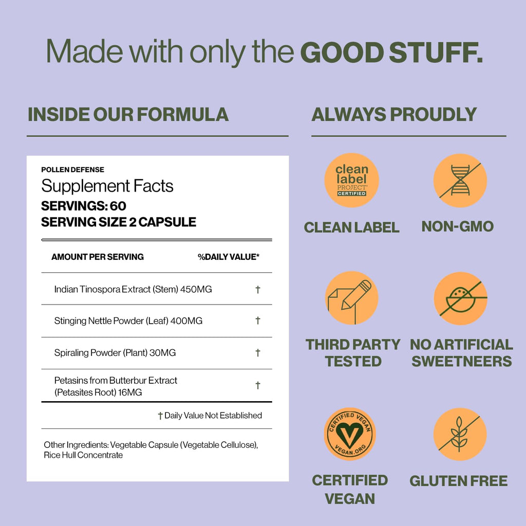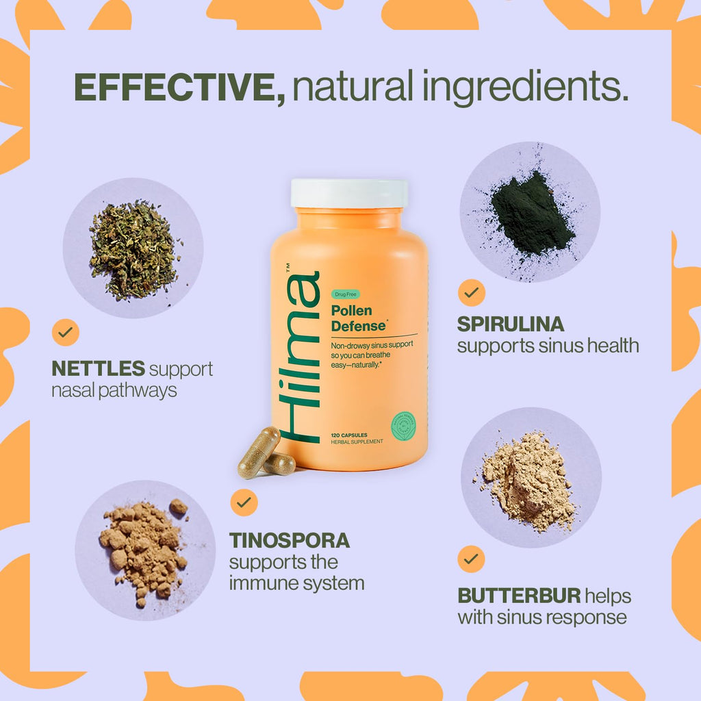 - Safe & Effective - Includes 4 natural ingredients clinically proven support healthy sinus passages from triggers like pollen and dust: Nettles, Butterbur, Tinospora and Spirulina.* Always 3rd-party lab tested.