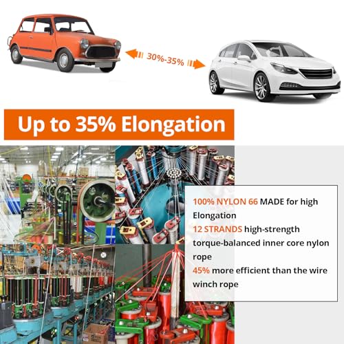 - Premium Material & Higher Elastic Elongation: Crafted from 100% nylon 66 for extended durability.12-strand high-strength torque-balanced nylon inner core provides exceptional resilience and wear resistance, outlasting 8-strand recovery tow ropes. Up to 30%-35% stretch capacity, the ideal choice for safest and smoothest vehicle recovery from mud, sand, or snow, offering impact-free towing that leaves your vehicle unscathed