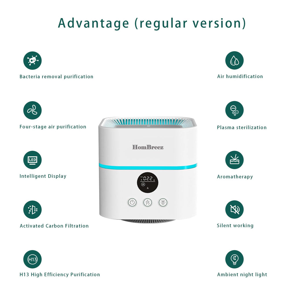 - High Efficiency Purification: HomBreez Air purifier equip with H13 True HEPA Filter and high-efficiency filter system, The compact frame and 360°design help the air purifier purify the air wherever you put it, such as bedrooms, living rooms, kitchens, tabletop, desk, shelf or office.This air cleaner is a nice size for a small/medium room, or as an additional filter in a large room.