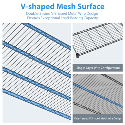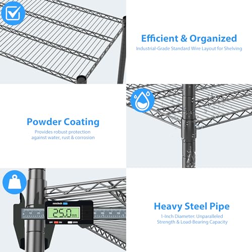 - 【COMMERCIAL GRADE LOAD CAPACITY】The heavy duty shelving unit holds up to 2500 lbs on leveling feet (800 lbs on wheels), featuring sturdy carbon steel construction with 1-inch pipes and reinforced dual-layer design. Its powder-coated finish ensures rust resistance, making it suitable for industrial-grade use