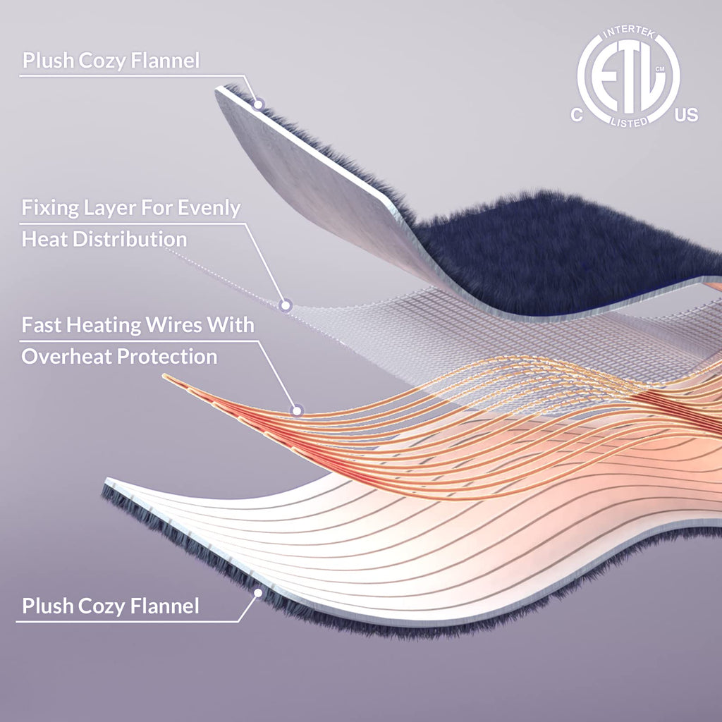 - ADJUSTABLE AUTO-OFF & OVERHEAT PROTECT - Validated by ETL & FCC, our heated blankets come with 1-12hrs auto-off timer suitable for an afternoon nap or overnight sleep. PTC & NTC intelligent technology will detect the temperature of heat wire the whole time for overheat protect.