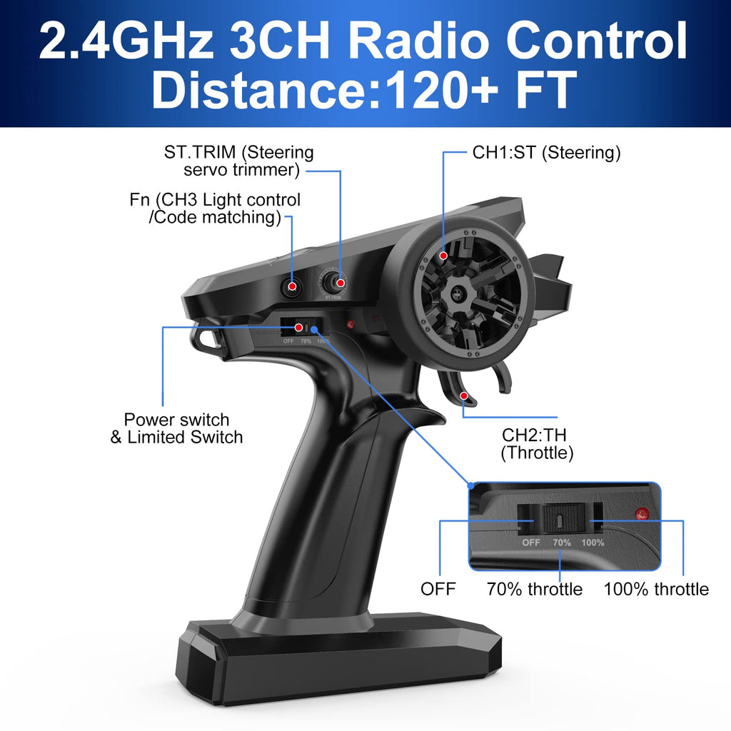 - Transmitter: 2.4GHz 3-Channel Radio with light bar control, 70% throttle limited switch great for beginners