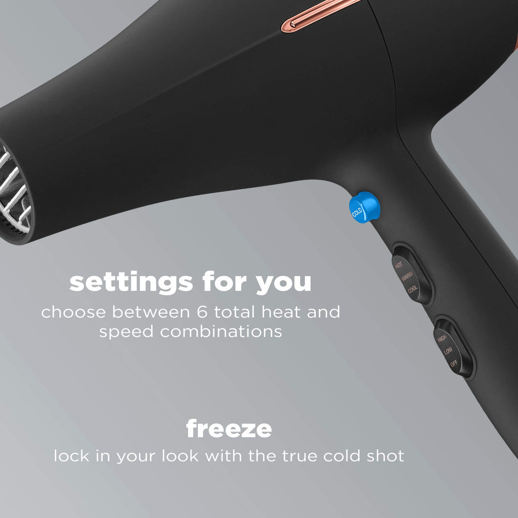 Details: Get fast drying, frizz free volume with the Infiniti PRO by Conair 1875 Watt AC professional hair dryer. This sleek blow dryer with a comfortable velvet Touch finish and modern rose gold accents is the perfect accessory for anyone looking to add a bit of style into their daily routine. The professional AC motor delivers powerful airflow for up to 50% faster drying time and 3x longer dryer life. The ionic technology in this hair dryer helps increase smooth, shiny-looking hair and up to 75% less frizz. This Dryer's ceramic technology has infrared heat that provides uniform heat for fast drying and less damage. The true cold shot button in this modern-looking blow dryer locks in curls, waves and styles. The rocker switches provide 3 heat/2 speed settings for different hair lengths and the removable filter prevents damaging lint buildup and extends motor life. When compared to other Conair DC motor hair dryer models when compared to hair dryers with natural ion generation.