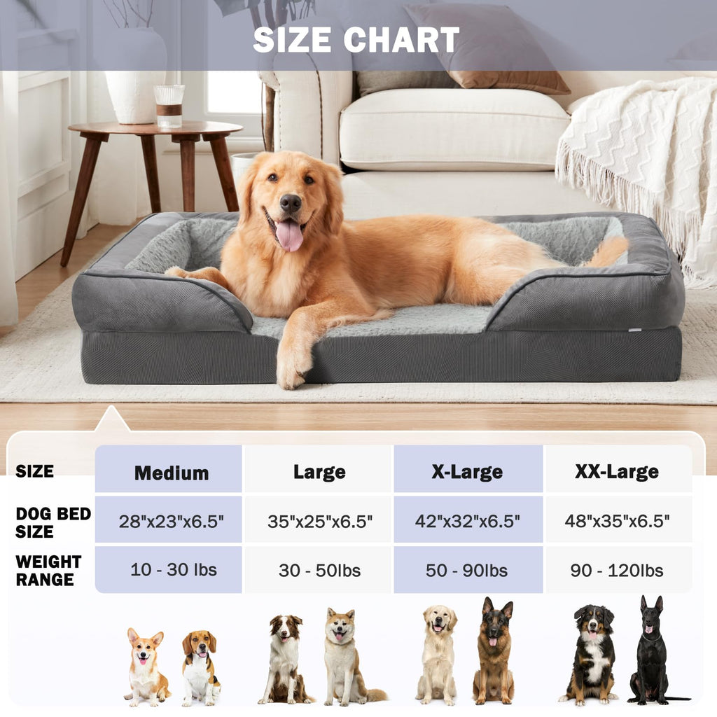 - 🐶SIZE DETAILS: Orthopedic Dog Bed, Medium, 28" x 23" x 6.5" (3.5" Base Foam Height; Sleep Surface: Approx. 20.5" x 19") For Dogs Up to 30 lbs. Large - 35" x 25" x 6.5" (3.5" Base Foam Height; Sleep Surface: Approx. 26.5" x 20") For Dogs Up to 50 lbs. Extra Large - 42" x 32" x 6.5" (3.5" Base Foam Height; Sleep Surface: Approx. 34" x 27.5") For Dogs Up to 90 lbs. XXL -48" x 35" x 6.5" (3.5" Base Foam Height; Sleep Surface: Approx. 39.5" x 31") For Dogs Up to 120 lbs.
