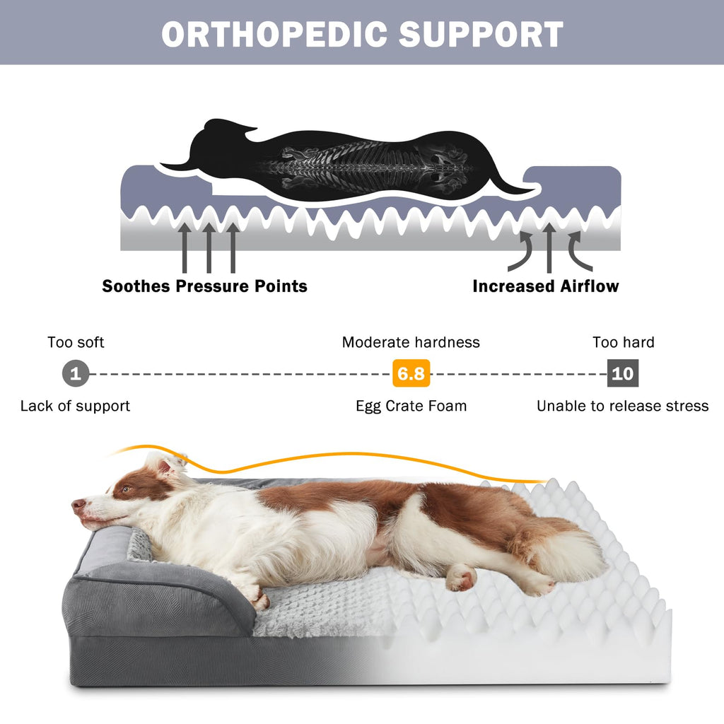 - 🐶ORTHOPEDIC SUPPORT: Orthopedic dog bed features high-density egg foam soothes pressure points helps distribute weight evenly and provides great support for aching joints and muscles so pets can enjoy a more restorative night's rest. While fluff-filled bolsters support the neck, back, hips, and joints; helps ease discomfort and promote restful sleep.