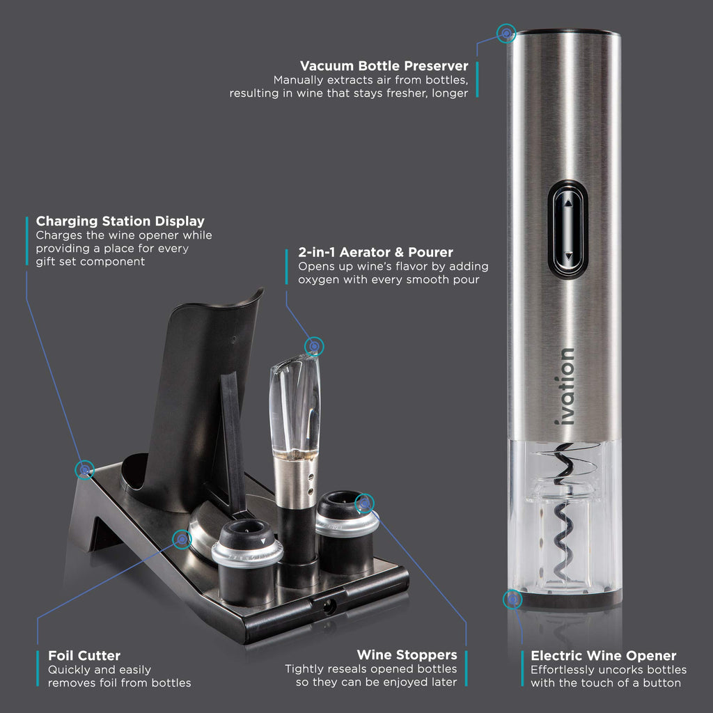 Discover a superior sipping experience with this all-in-one Wine Gift Set from Ivation. Featuring all the tech-savvy essentials you need to savor each glass to the fullest, our complete kit arrives with an automatic wine opener, electric vacuum preserver, aerating pourer, date-stamped stoppers and other goodies just waiting to be discovered. Whether you’re shopping for a birthday, anniversary, Christmas or another special occasion, sleek lines and sophisticated stainless steel make the perfect present for wine-loving men and women alike. Just pick up a nice bottle of white or red, and add this Wine Gift Set from Ivation to your cart today!