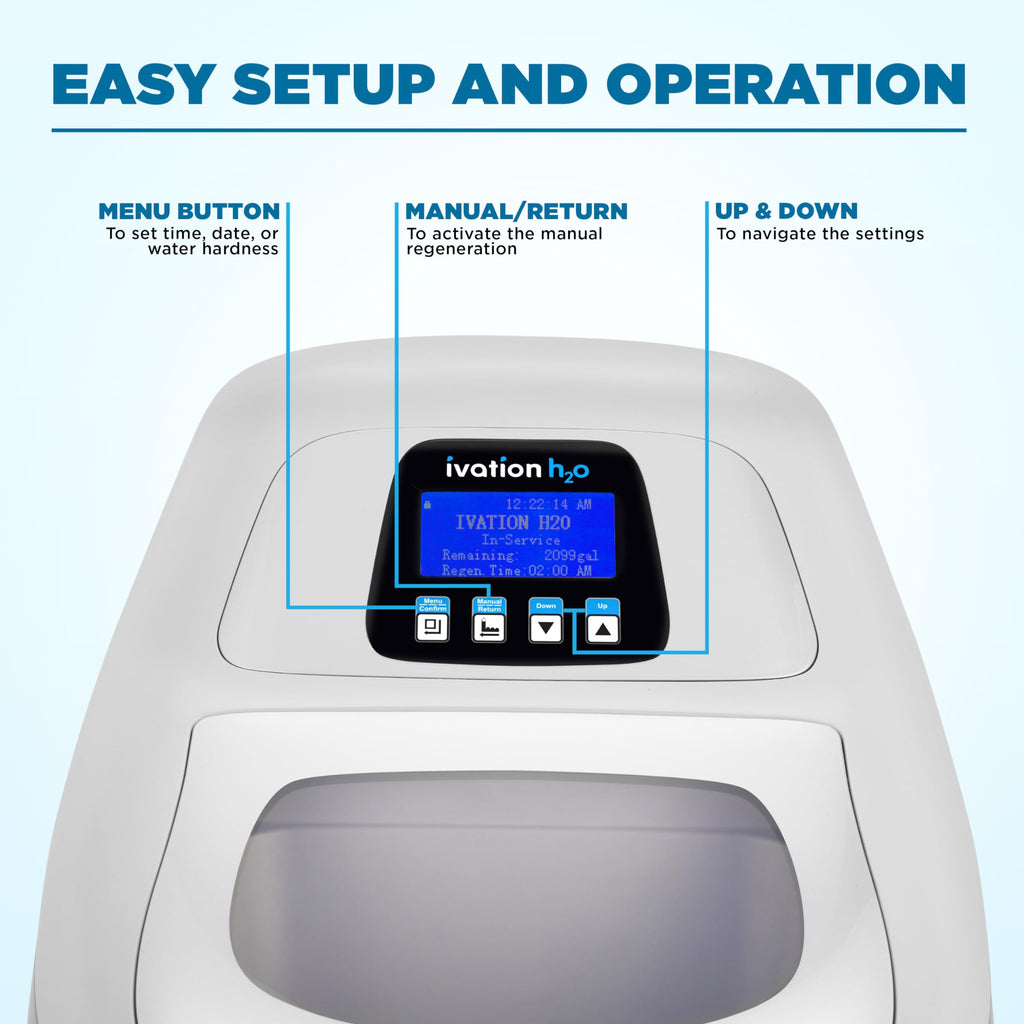 - SMART AUTOMATIC PREDICTIVE REGENERATION - Enjoy soft water 24/7 with our intelligent water softener system, which monitors household usage and automatically regenerates only when needed—helping you conserve salt and water. Features include a double backwash mode for high iron levels, internal diagnostics, usage tracking, error code notifications, blackout memory, and customizable settings based on your household's water softners needs.