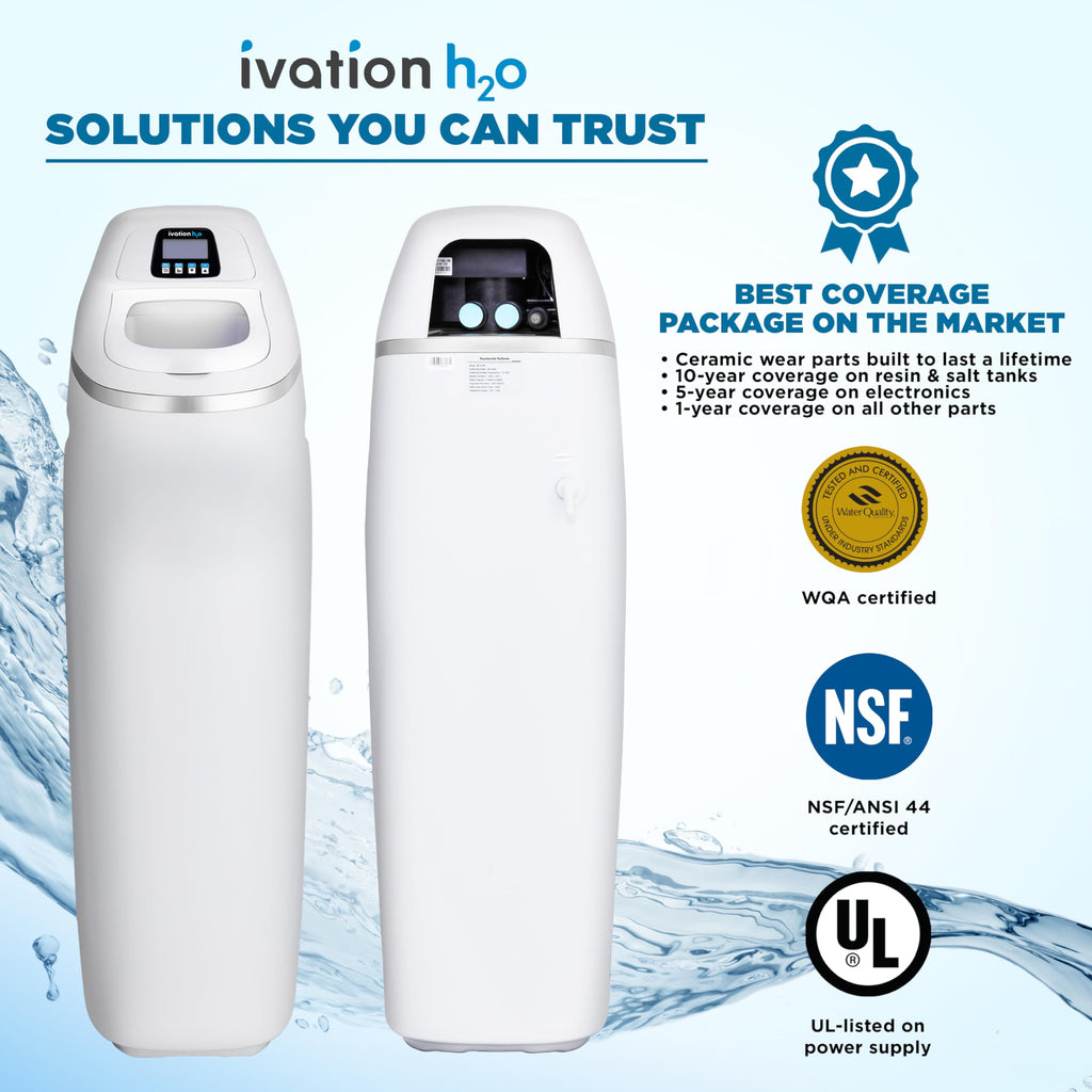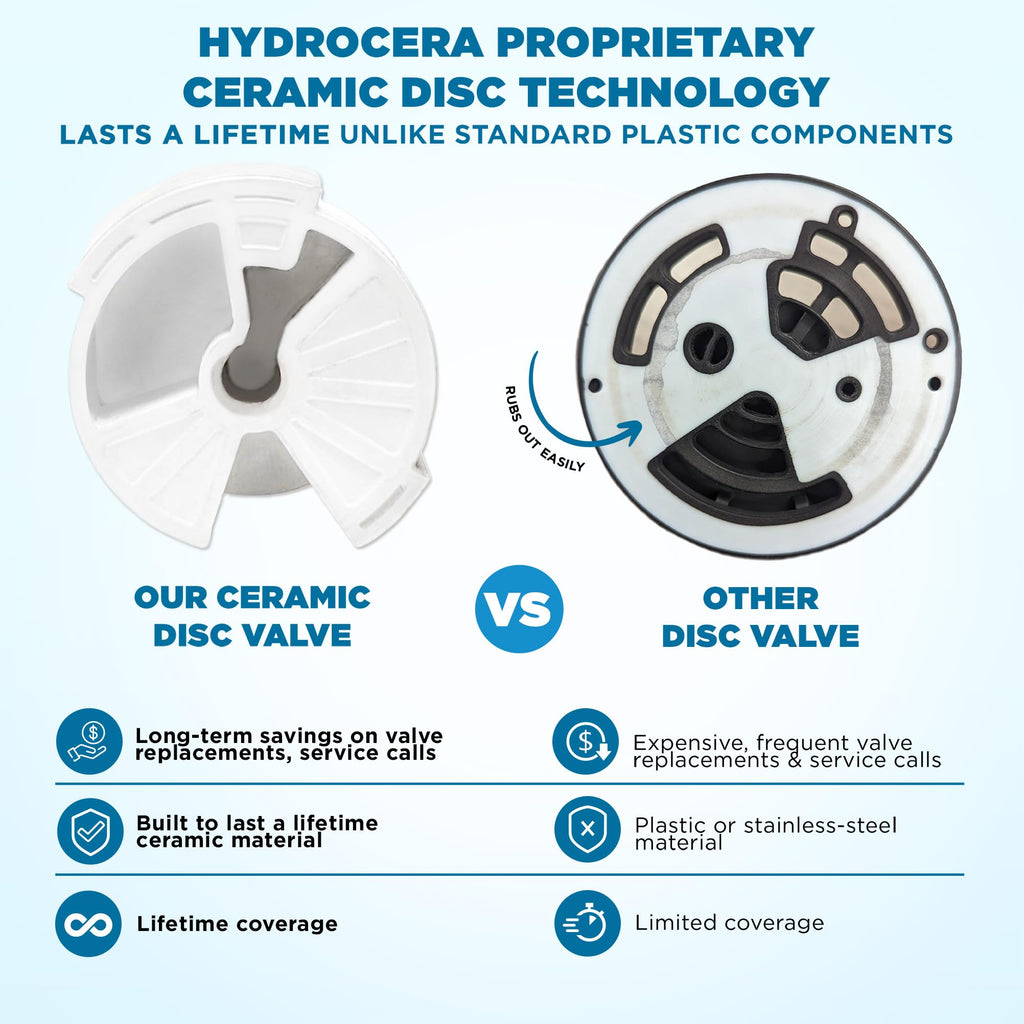 - ADVANCED HYDROCERA CERAMIC TECHNOLOGY – Patented & Long-Lasting, Our home water softener system whole house model features the only patented main control valve, bypass valve, and internal parts made with aerospace-grade HYDROCERA ceramic—lasting 100x longer than plastic components used in other water softener systems. This home water softener enhances appliance efficiency, saving energy across dishwashers, heaters, and kettles, and includes a brine guard safety valve for leak prevention.