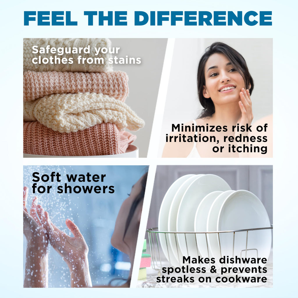 - CLEANER WATER & EXTENDED APPLIANCE LIFE - Our soft water system uses advanced ion exchange to effectively remove calcium and magnesium from hard water, resulting in a water softener for home use that delivers cleaner drinking water, shinier dishes, softer laundry, and longer-lasting appliances like washing machines and water heaters. This water softner for home also promotes healthier skin and hair by reducing soap scum and dryness.
