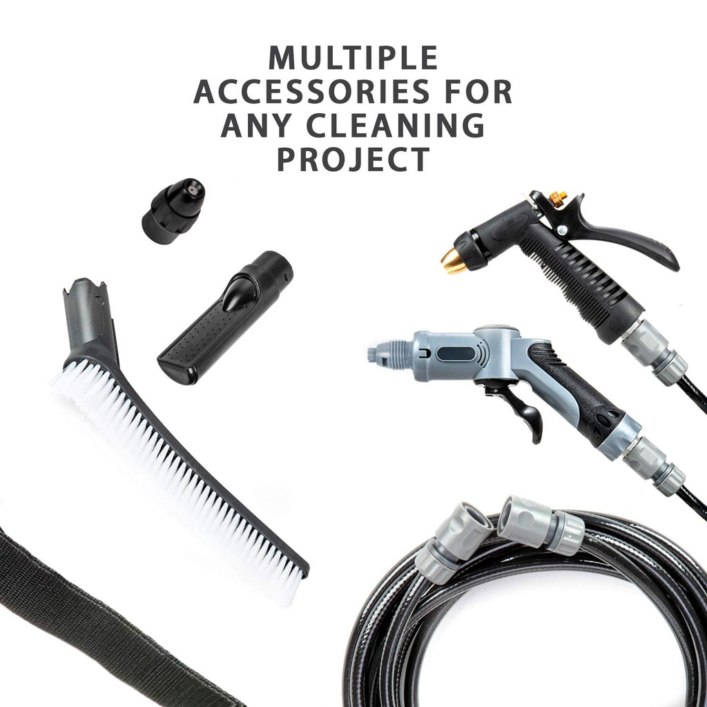 - BONUS CLEANING ACCESSORIES – Handle Every Tough Job w/ Included Metal Gun for Cleaning; Multi-Function Plastic Gun for Light to Heavy Stream; Brush Head for Scrubbing Pets & Soft Fabrics; & Personal Shower Head for Outdoor Bath