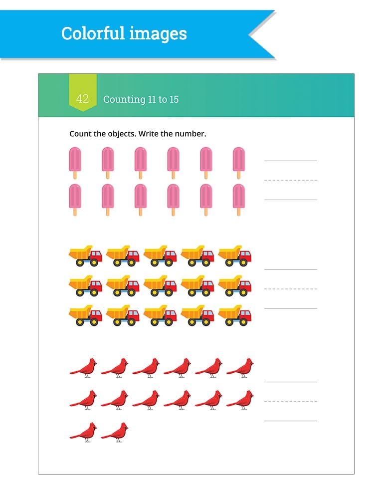WIDE SPECTRUM OF KINDERGARTEN MATH TOPICS: Your child will be mastering essential math and arithmetic skills, including reading, writing, and counting 0 to 20; comparing and ordering numbers to 20; counting by tens; and counting to 50 and 100.