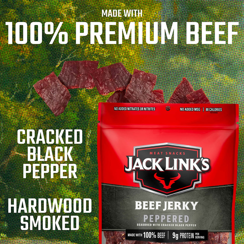 Details: Ancient civilizations fueled themselves with meat. How'd they build pyramids or win sword battles? Meat. If it worked for them, it can definitely help you power through. Maybe you won't be building pyramids, but endless to-dos, kids' activities and classes, the daily grind of work, squeezing in a workout and so much more can feel just like it. No matter what you're tackling, our beef jerky is the perfect snack choice to make it through. Love a little spice? Our Peppered Beef jerky delivers. Expertly seasoned with a special blend of herbs and spices and finished off with cracked black pepper. Then, it's slow roasted over hardwood smoke. Each savory bite is filled with a peppery punch of perfection. And not only does it have delicious, peppery and meaty flavor, it's packed with protein – 9g per serving, to be exact. And with only 80 calories, it's a flavorful, must-have snack to help keep you satisfied and energized all day. When you rip open a bag of Jack Link's, you will get a taste of the American tradition that made this family business a success: hard work, fun and quality products.
