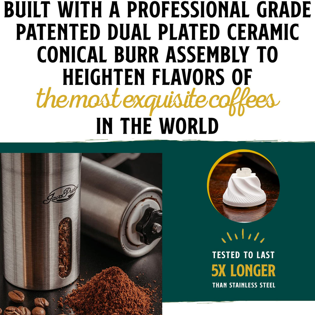 - CONVENIENT, PORTABLE, AND EASY-TO-USE ESPRESSO GRINDER ― The hand crank grinder eliminates 90% of electric grinder noise. JavaPresse's patented manual ceramic burr assembly needs no batteries or cords, making it perfect for fresh coffee at home or on the go. It's the ultimate camping coffee grinder and pairs perfectly with your coffee maker, offering a noise-free grinding experience.