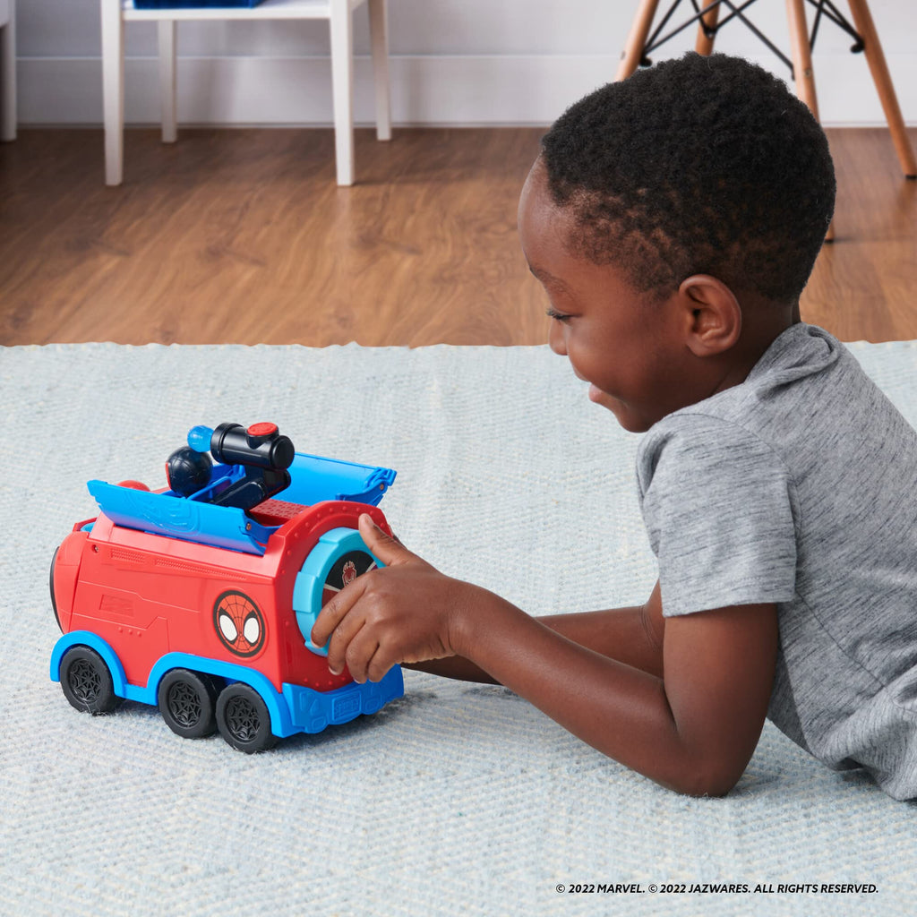 Details: Save the city with the Spider Friends and their amazing Web Spinning Hauler. Join Spidey, Ghost-Spider and Miles Morales: Spider-Man as they chase down villains inside this 8-inch 3-in-1 transforming Hauler. Spidey takes the wheel as Ghost and Miles operate two Web Dart Launchers. Spin the dial on the Hauler’s rear to the correct symbol and either Ghost or Miles will emerge from the roof with their own Web Dart Launcher. Press the button on each launcher to blast out a Web Dart at any villain. Spin the dial back to the Spidey symbol and the Hauler’s roof will close as Spidey maintains pursuit. Collect this transforming 3- in-1 vehicle and more Marvel’s Spidey and His Amazing Friends toys.