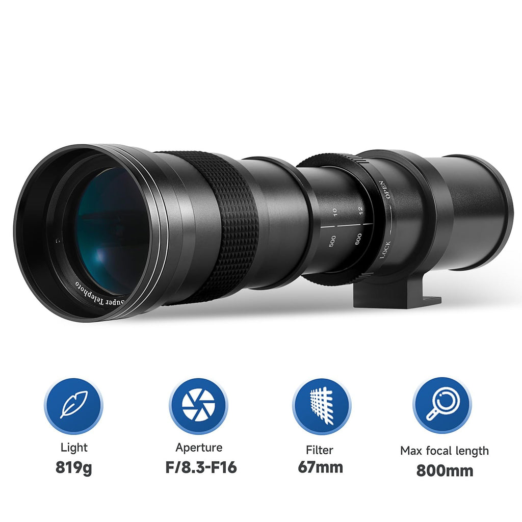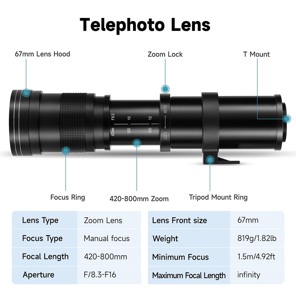 - ★ JINTU 420-800mm MF Super HD Telephoto lens, Solid Construction with full metal body, Small size 10.6 x 3.5 x 3.5 inch, lightweight 700g=1.8LB, easy to carry to anywhere.