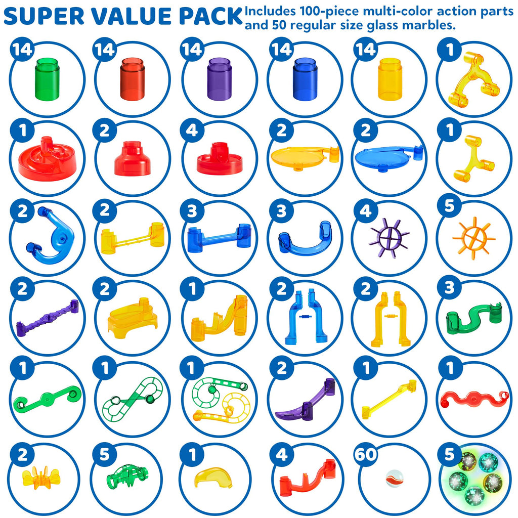 - 207 Pcs premium marble run set with transparent parts, endless fun for your child to watch marbles run along tracks.