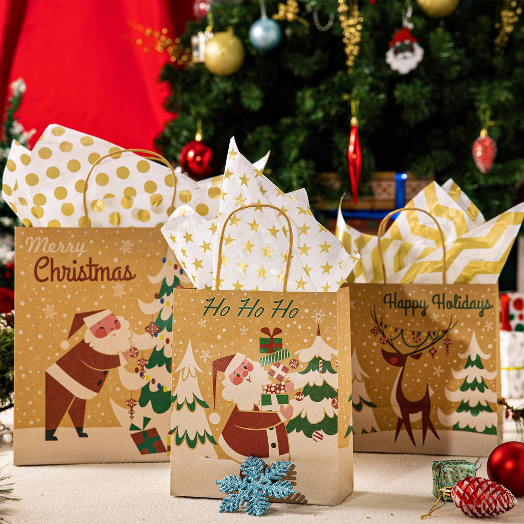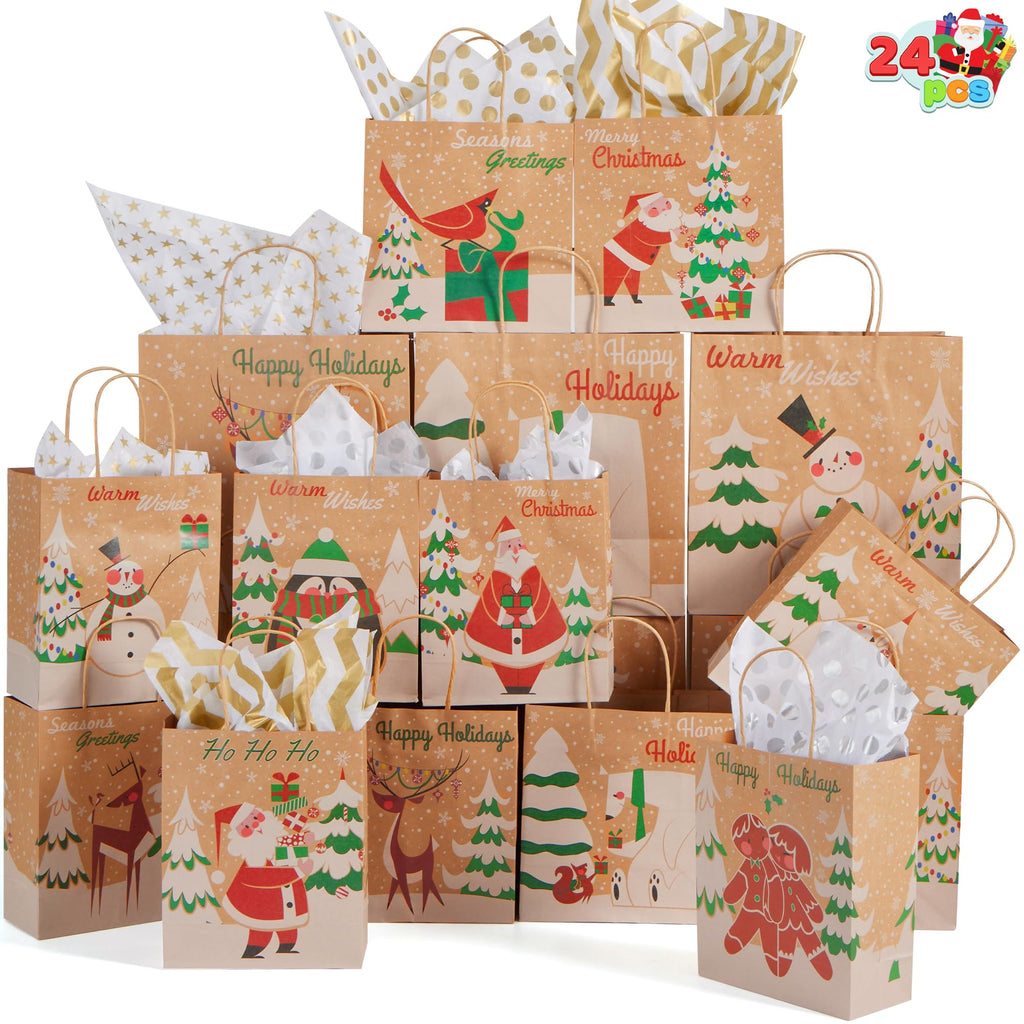 - Christmas Kraft Gift Bags includes 24 Assorted Christmas Design Kraft Gift Goody Bags with 12 Different Designs in 3 sizes Bags.