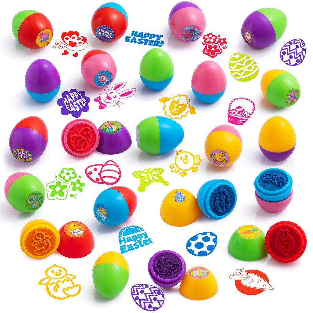- SUPER VALUE PACK. Our Easter Basket Stuffers include 24 pieces of adorable and colorful easter egg stampers.