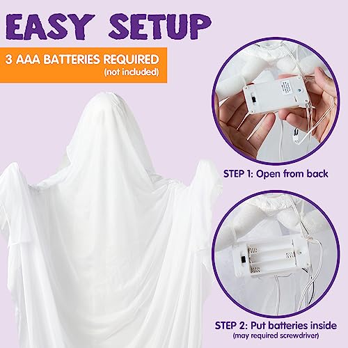 Details: JOYIN Halloween Light-up Hanging Ghost, Flying Ghost with Blue Glowing Body for Halloween Haunted House Prop, Indoor/Outdoor, Tree, Patio, Yard, Lawn Garden Decorations