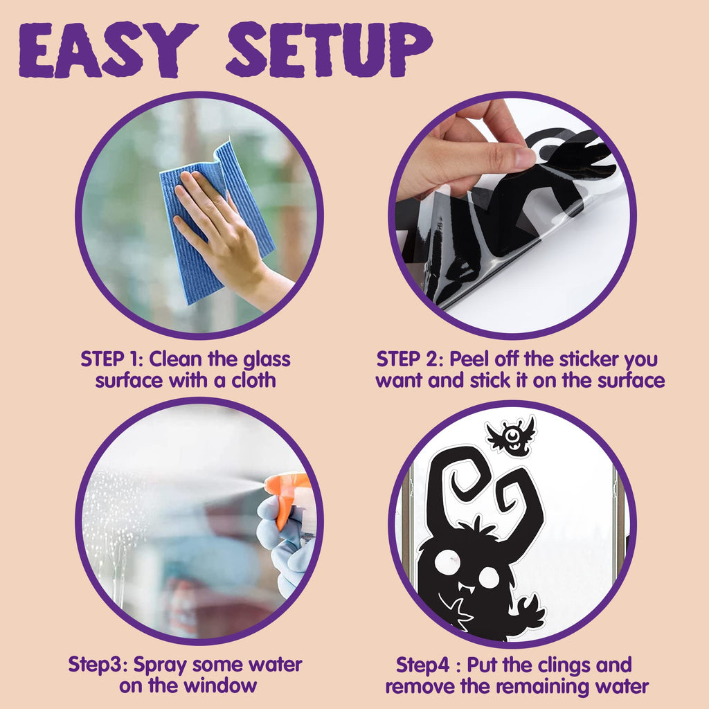 - EASY SET-UP: These window clings for Halloween decorations are used with no glue, are easy to peel off, and are reusable. Once this Halloween clings for windows are in place, use a firm card to force out any trapped air by sliding from the center to the edges.