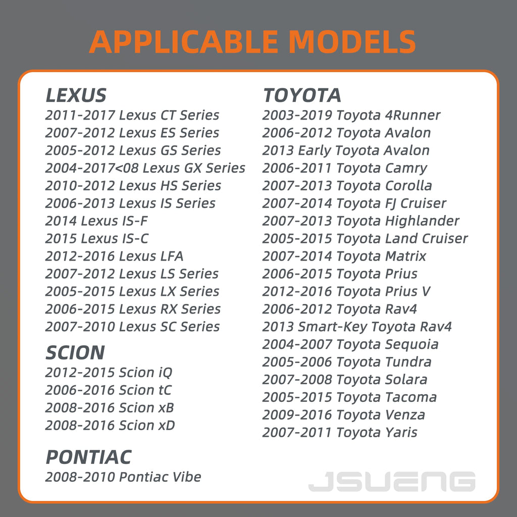 - 【Fitment/Compatibility】: The TPMS sensor fits for 2003-2019 Toyota 4Runner, 2006-2012 Toyota Avalon,2013 Early Toyota Avalon,2006-2011 Toyota Camry,2007-2013 Toyota Corolla,2007-2014 Toyota FJ Cruiser,2007-2013 Toyota Highlander,2005-2016 Toyota Land Cruiser,2007-2014 Toyota Matrix,2006-2015 Toyota Prius,2012-2016 Toyota Prius V,2006-2012 Toyota RAV4 (Detailed Application Below)
