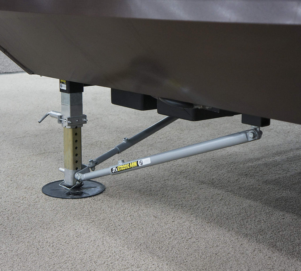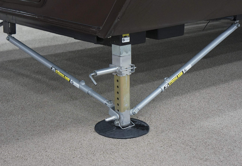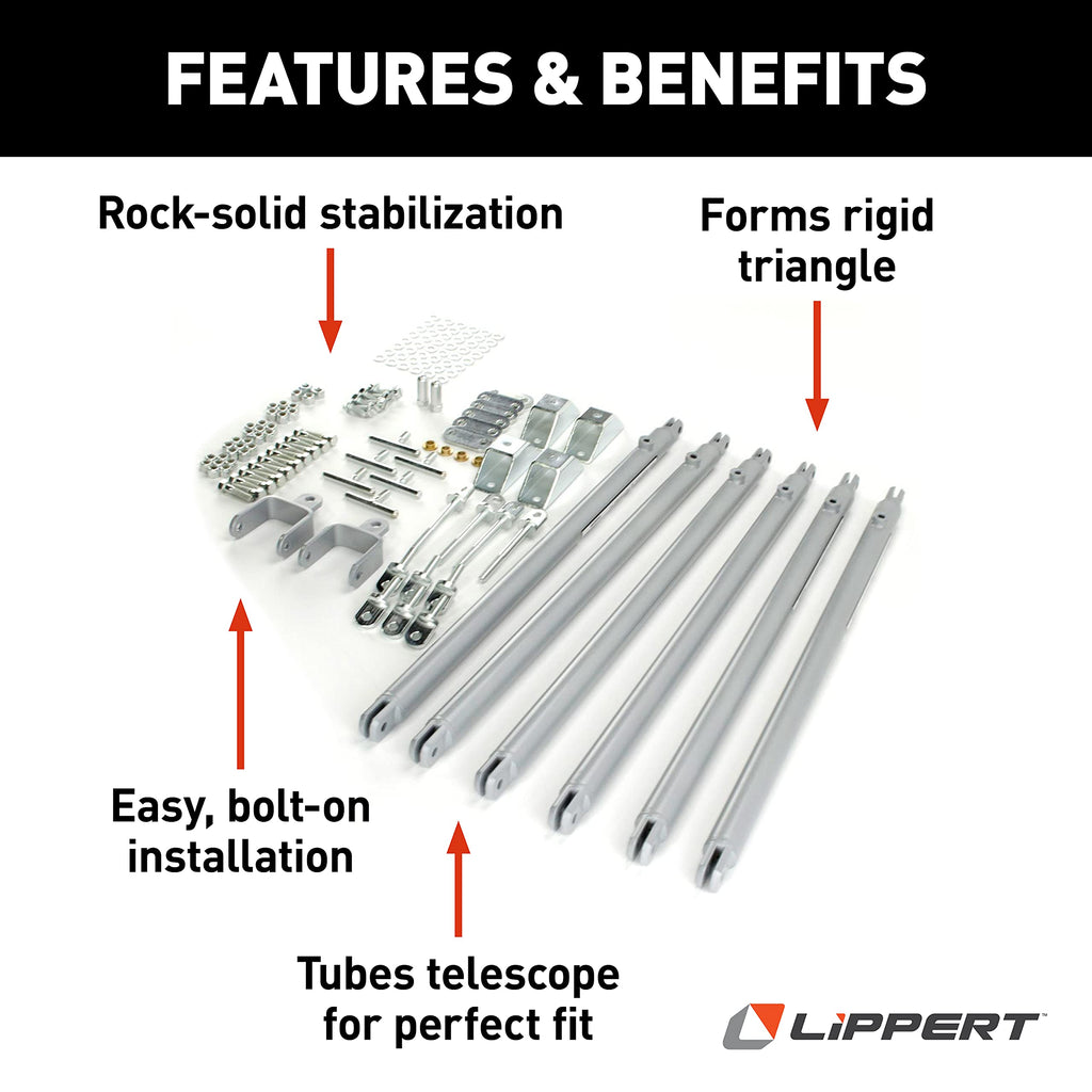 Details: Tired of your RV rocking and swaying back and forth? Using race car stabilization technology, JT's Strong Arm jack stabilizers by Lippert use triangles — the strongest shape in nature — to eliminate unwanted chassis movement. One end of each stabilizer tube attaches to each landing gear leg and the other to your 5th wheel RV or travel trailer’s frame, forming a rigid, durable triangle. There is no welding required and no need to remove and reattach during setup. It's permanent. When parked, JT's Strong Arm jack stabilizers telescope into place with the jacks.The patented universal system is designed to attach to the three main types of jacks found on RVs: scissor, front landing gear and telescoping.Complete with three outer tubes, three inner tubes and all necessary mounting hardware — an easy, one-time installation is all it takes to put this stabilizer kit on your RV. This means getting rid of chassis movement just got a whole lot easier. From wind gusts to uneven terrain, you can count on JT’s Strong Arm to help eliminate your chassis movement for a more stable, comfortable camping experience.Whether you’re on the road or on the water, Lippert supplies a broad array of premium RV, towing, and marine products designed to enhance all of your recreational pursuits. Our team is committed to always thinking about your next journey — pushing the possibilities of our products and services, all to better your time spent outdoors, whenever, wherever, for years to come.