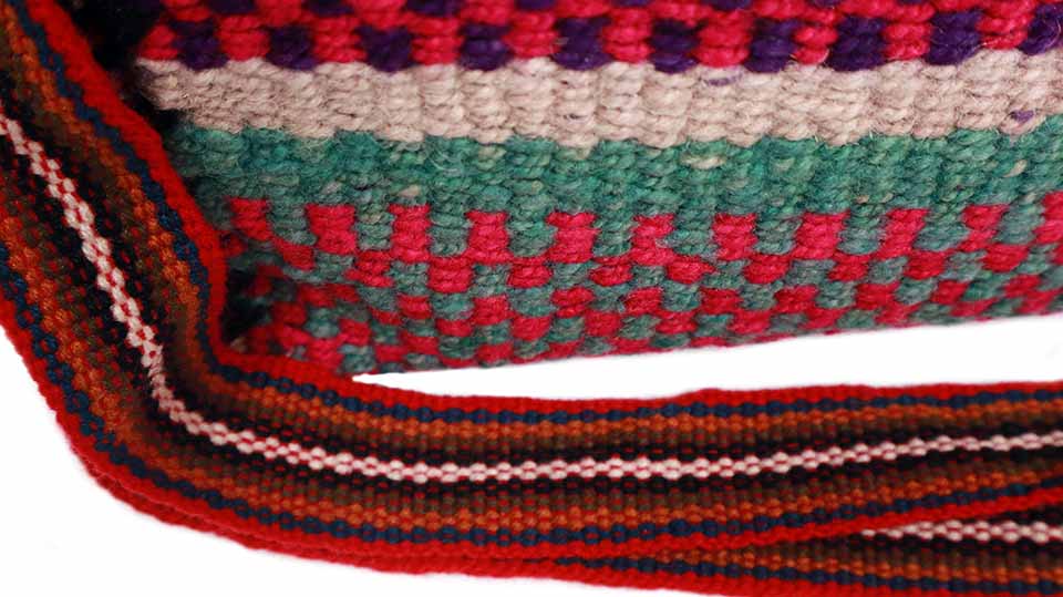 Sheep wool is dyed by using natural dyes from wood, leaves or flowers. This bag is durable but also has delicate and intricate designs woven into its textile.